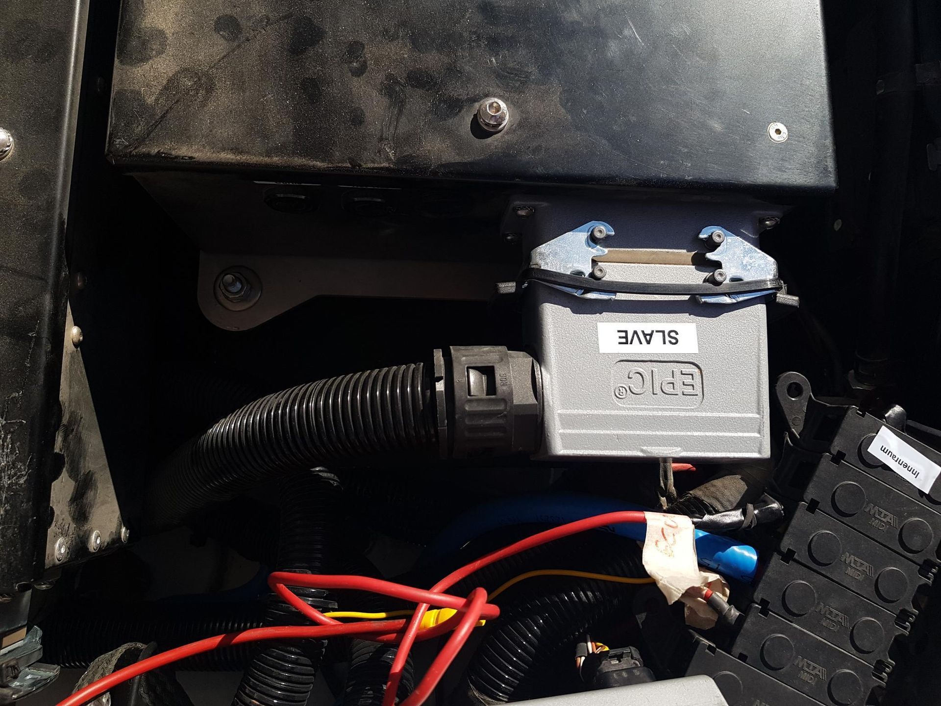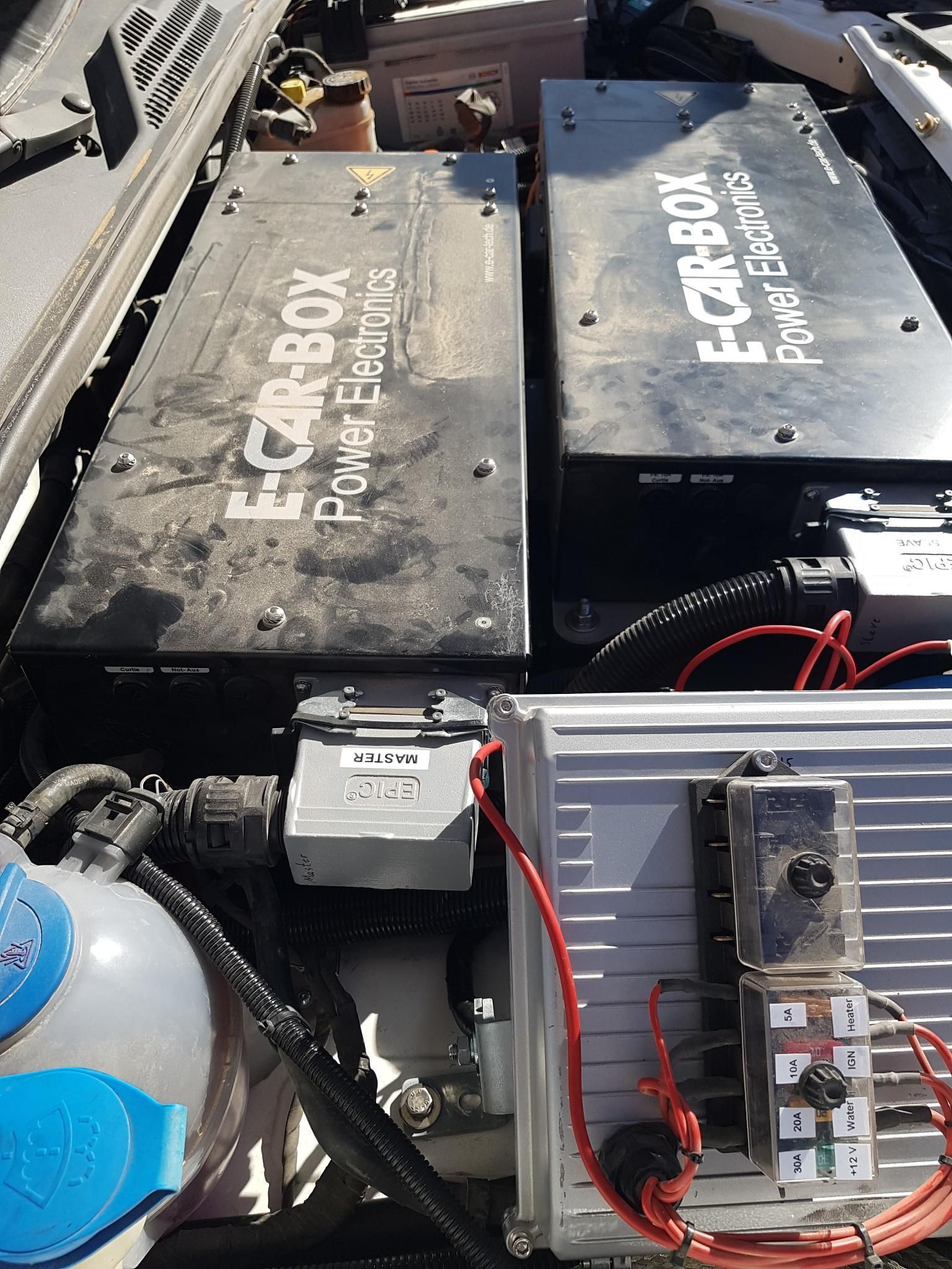 Die Verkabelung in der Nahe der ECU musste neu gemacht werden, und die ECU selbst bekam eine etwas geänderte Position. Abgerissene Kabel wurden ersetzt und neu angeschlossen. Alles funktioniert soweit wieder bis auf das ABS-Steuergerät. Da schaue ich morgen danach. Um ca. 14:30 kam der Renntruck um die Ecke gepoltert, und mit großem hallo wurde er empfangen und in Augenschein genommen. Bis auf eine verbogene Stoßstange und defekte Lichter (wieder einmal!) sieht es nicht nach viel Arbeit aus. Um 16 Uhr waren die Fahrzeuge dann auf die Anhänger verladen, und es ging los auf die 850 km lange Fahrt nach Riyadh - die wohl bis 2 Uhr in der Frühe dauert.'