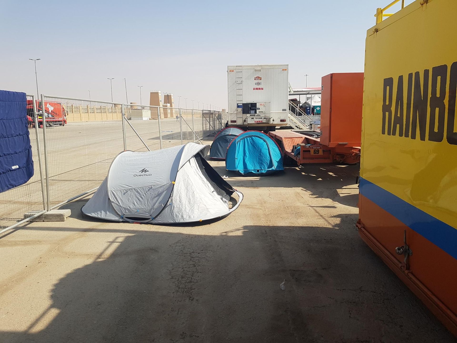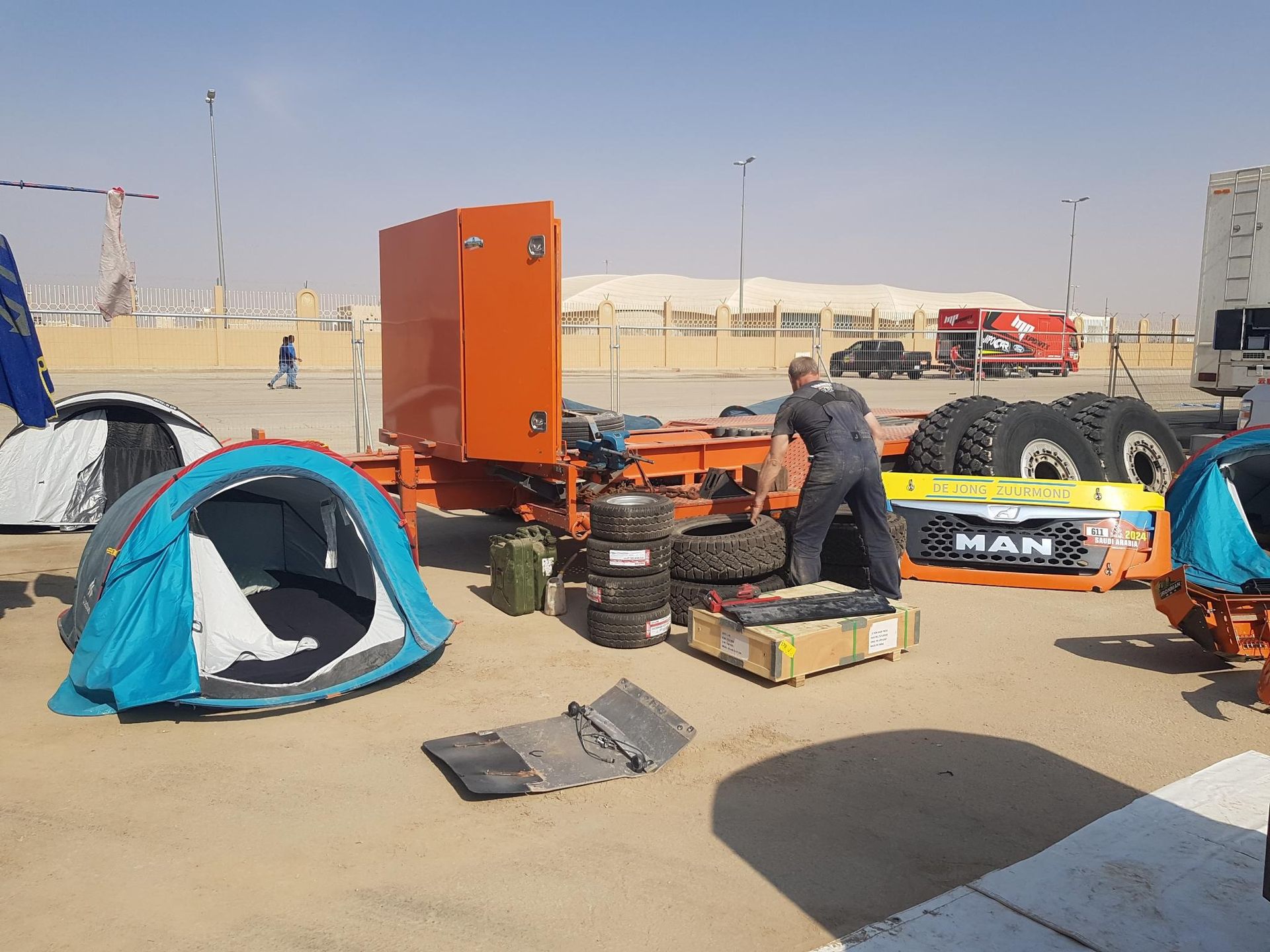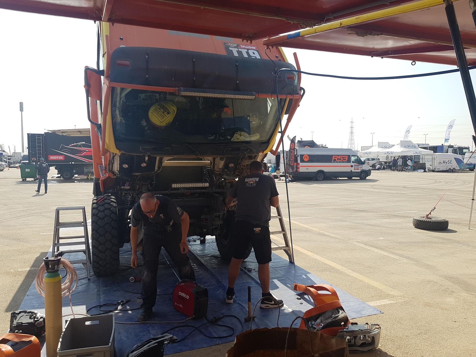 'Heute ist der 15. Januar, und die 8. Wertungsprüfung für den Amarok steht an. Gestern Abend kamen wir erst sehr spät im Biwak an, erst so gegen 21 Uhr. Jeder suchte sich seine Sachen zusammen, und  baute sein Zelt auf. Dann wurde ein neuer Reifen aufgezogen, der alte war je gestern defekt geworden, durch einen Stein wurde die Seitenwand beschädigt.                     Dann ging's schnell zum essen, Wasserstoff tanken, den Akku laden, das Auto durchchecken, kleinere Reparaturen machen. Viel gab's nicht zu tun, allerdings ist uns irgendwie der rechte vordere Innenkotflügel abhanden gekommen - liegt wohl irgendwo in einer Düne. Falls ihn jemand zufällig findet, bitte bei uns abgeben 🙂                               Die Jungs vom Rainbow-Team hatten natürlich eine Lösung parat, sie haben aus einer Gummi-Fußmatte entsprechende Stücke geschnitten und mit Kabelbindern befestigt - sieht fast besser aus als das Original... Ins Zelt ging es dann so gegen 1 Uhr morgens nach einer lauwarmem Dusche. Kurz danach um 5:30 klingelte schon wieder der Wecker, denn wir mußten um 6:15 wieder auf die Strecke - 400 km zum nächsten Start! Irgendwie schleicht sich das Gefühl ein, dass sich das Zelt aufbauen nicht wirklich gelohnt hat...'                                                                                             'Am Startpunkt angekommen, herrschte eine lockere Atmosphäre, die Teams untereinander kennen sich schon, man spricht über die Strecke, wie gestern lief, und über die Technik. Jeder Fahrer rollte dann pünktlich zum Start und machte sich auf den Weg, der Amarok als zweitletzter um 12:32. Die Strecke heute ist 72 km lang, gut befahrbar, mit nur einigen sandigen Abschnitten. Die Herausforderung liegt heute eher in der Navigation, damit man in diesem flachen Gelände mit einigen Hügeln immer der richtigen der vielen Spuren folgt. Wir sind gespannt wie sich die Crew des Amarok da schlägt!'