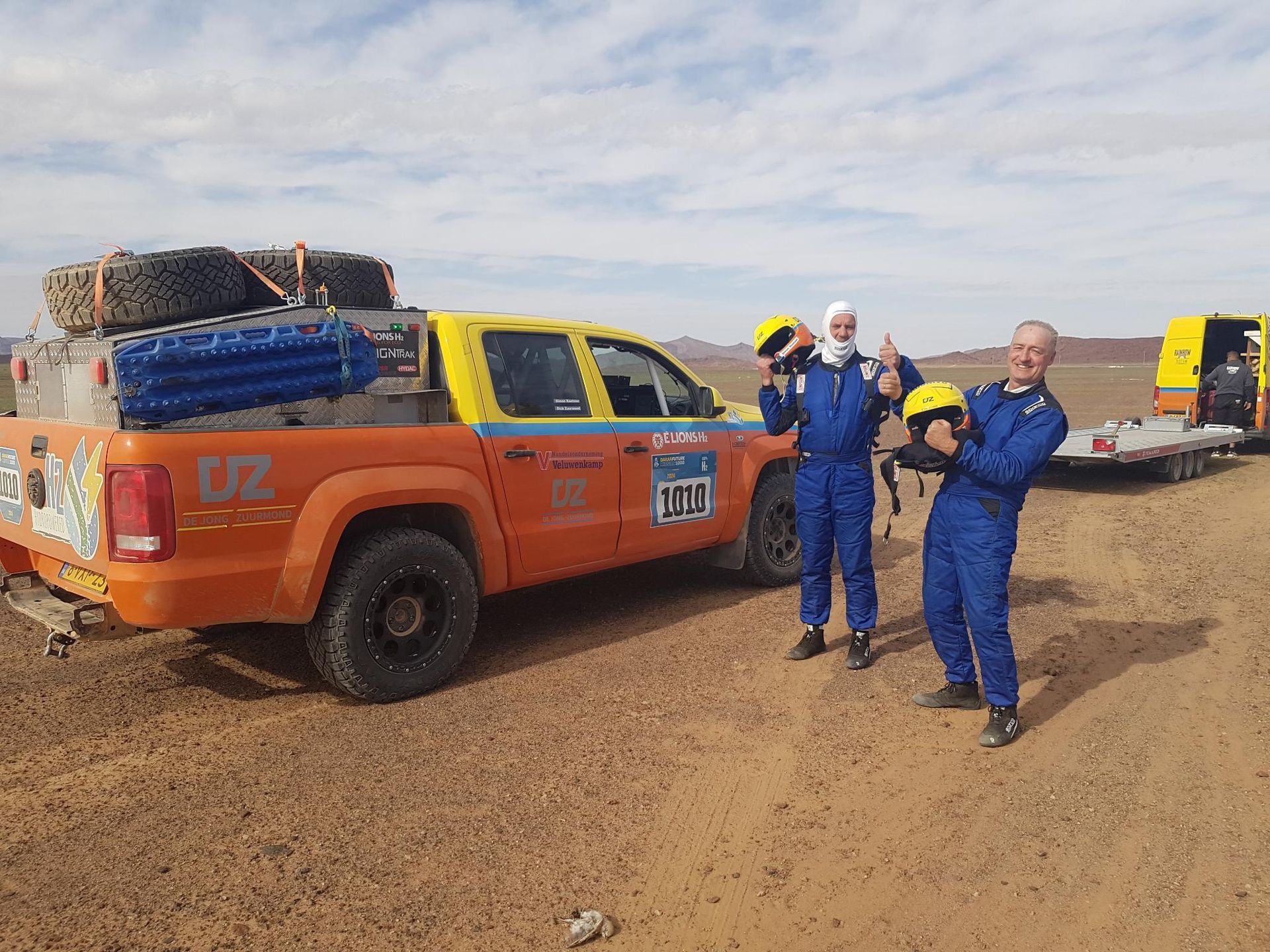 'Neuer TextUnd beinahe haben wir den Amarok am Ziel verpasst, wir mussten ca. 125 km weit fahren, die Teilnehmer "nur" 77 km...kurz vor dem Ziel kamen uns schon der Truck und ein Anhänger mit einem Motorrad entgegen - und dann konnten wir doch noch ein Zielfoto mit dem Amarok machen! Wieder eine problemlose Fahrt, die Crew ist sehr zufrieden. Als letzte gestartet, und als letzte angekommen, es gab keine Ausfälle heute. Sie hätten nicht schneller fahren können, höchstens mit weniger Gewicht oder verstärktem Fahrwerk... Also, Wasserstoff und Akku waren gerade mal halb leer! So machen wir uns jetzt guter Laune auf ins nächste Biwak!'