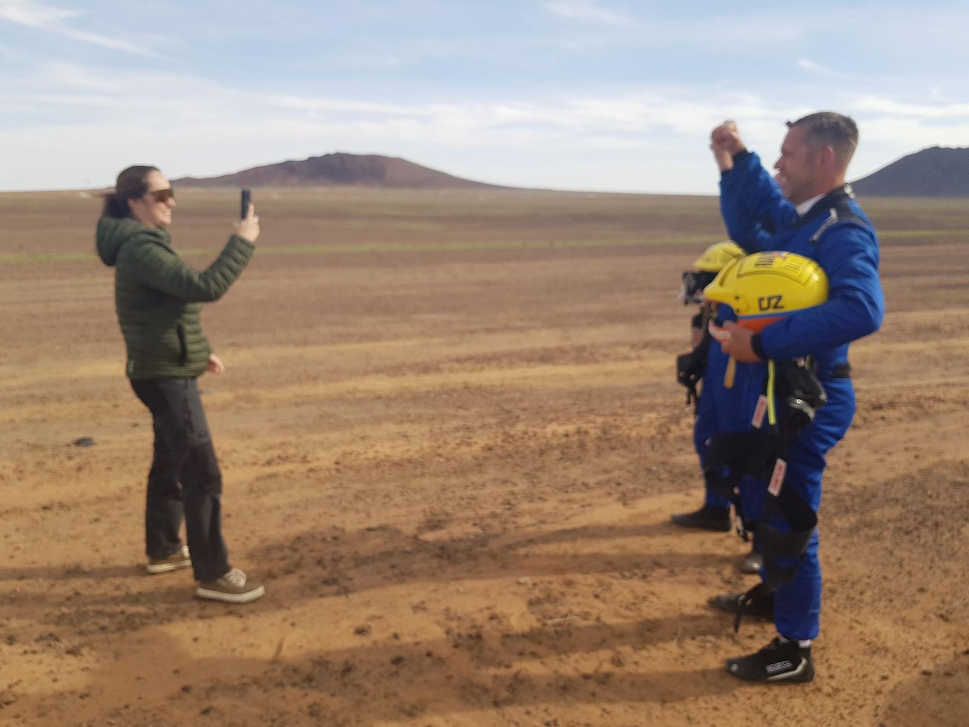 'Hallo zusammen, hier das heutige Update der Rallye Dakar am Sonntag, 14. Januar für die 7. Wertungsprüfung der Mission Mille. Nach einigen Stunden Fahrt haben wir den Startpunkt der heutigen Strecke erreicht. Dort sahen wir auch die anderen Teilnehmer wieder, die heute alle wieder vollzählig an den Start gingen.                                            Die Kollegen von Takita hatten tatsächlich ihr zweites Motorrad wieder reparieren können (das bei dem vor einigen Tagen der Motor Controller durchgebrannt war), so dass nun wieder alle 10 Starter dabei sind. Es starteten zuerst die 6 Motorräder, danach die 2 Buggys, dann der Amarok, gefolgt vom großen Renn-Truck.                                                                    Danach fährt als "Lumpensammler" noch ein Truck von Boucoup, das ist ein vom Veranstalter gecharterter Rettungs-Truck, der liegen gebliebene Fahrer aufsammelt und die Fahrzeuge, wenn möglich, abschleppt. Nachdem alle gestartet waren, machten wir uns auf den Weg zum Ziel. Dieses bekommen wir immer am Abend vor dem Rennen als Koordinaten mitgeteilt, die Strecke selbst wird auf fest im Fahrzeug verbaute Tabletts geladen, und kann erst kurz vor dem Rennen per Code aktiviert werden. Diese wir dem Navigator dann als sogenanntes Roadbook gezeigt, also Symbole, die ihm Anweisungen geben und Hinweise auf Orientierungspunkte enthalten, die er dann erkennen muss und seinen Fahrer entsprechend lotsen.                                                                    Im Gegensatz zu den Teilnehmern können wir mehr oder weniger bequem auf öffentlichen Straßen zum Ziel fahren... Dort warten wir dann gespannt auf die Ankunft des Feldes.'